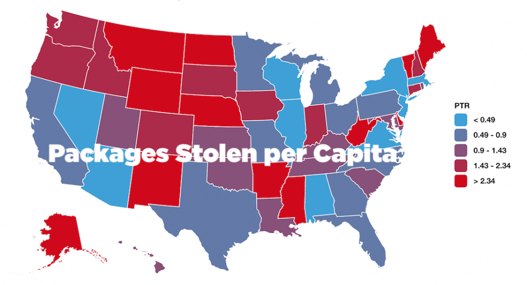 The Packages Stolen per State per Capita are weighed against the entire population within the United States so even though North Dakota has a smaller population of say California, it reveals it has more theft issues per person than larger states like California, New York and Texas. The full report broken down and weighed by population also includes other states like New Mexico, Nebraska, Maine, Wyoming and West Virginia. Lowest on the list was Virginia.